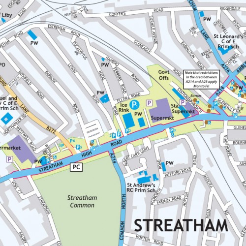 Streatham BID, established in 2013, sought a mapping solution to highlight the parking options for visiting shoppers to their 2.6 mile High Road and surrounding area.   A detailed street map of the BID area was produced to which specific information was added – car parks, parking restrictions, number of bays for loading, disabled use etc. In this case an experienced ground researcher was deployed to collect and verify latest information.